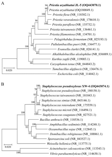 Identifications of (A) Priestia aryabhattai JL-5 and (B) Staphylococcus pseudoxylosus XW-4 based on phylogenetic analysis, i.e., the neighbor-joining trees constructed using 16S rRNA sequences, with Escherichia coli and Acinetobacter calcoaceticus/Vibrio parahaemolyticus used as the outgroups, respectively. The two bacterial taxa with 16S rRNA sequenced in this study are highlighted in bold. The GenBank accessions are given in the parentheses next to the names of the bacterial taxa. Bootstrap supports (%) based on 1000 replicates are given next to the branches on the tree.