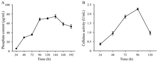 Phosphate-solubilizing ability of Priestia aryabhattai JL-5 (A) and cellulase-producing capability of Staphylococcus pseudoxylosus XW-4 (B). The error bars represent the standard deviations (n = 3) on each data point.