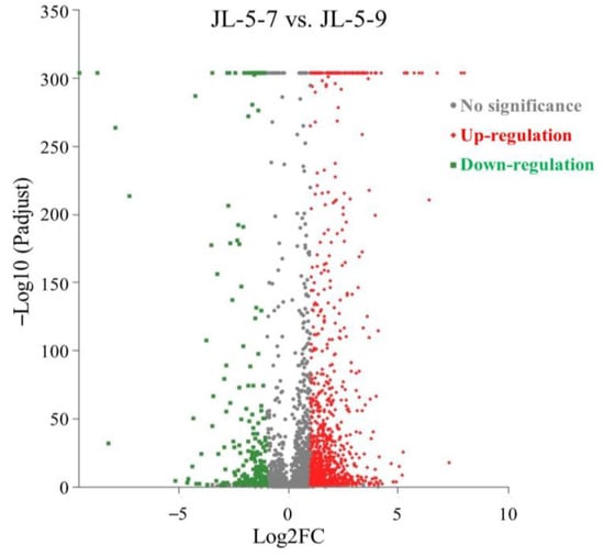 In order to identify the genes involved in the molecular response of the strain JL-5 to the saline-alkali stress, transcriptome sequencing was performed using the strain JL-5 cultured at pH 7.0 and 1% salt (i.e., the control labeled as strain JL-5-7) and pH 9.0 and 2% salt (i.e., the saline-alkali condition labeled as strain JL-5-9), respectively. The transcriptome sequencing and assembly characteristics are summarized in Table 1. The results showed that a total of 30,721,042 and 29,035,034 raw reads were generated under the control and saline-alkali conditions, with 28,333,104 (92.2%) and 26,955,132 (92.8%) reads mapped to the reference genome of Bacillus cereus (GenBank accession GCF_002220285.1 with genome assembly ASM222028v1). In comparison with the control, a total of 1304 differentially expressed genes (DEGs; 1,066 up-regulated and 238 down-regulated) were identified in the strain JL-5 under the saline-alkali condition (Figure 3; Table S1).