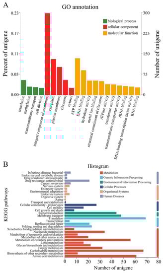 GO annotation (A) and KEGG enrichment analysis (B) of differentially expressed genes (DEGs) identified in Priestia aryabhattai JL-5 under the saline-alkali conditions.