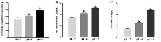 Variations in contents of lactic acid (A) and proline (B) as well as the glutamine synthetase (GS) activity (C) in Priestia aryabhattai JL-5 under different saline-alkali stress conditions, i.e., pH = 7 (1.0% NaCl), pH = 8 (1.5% NaCl) and pH = 9 (2.0% NaCl), respectively. Different lowercase letters, a, b and c, indicate the statistical differences based on p < 0.05.