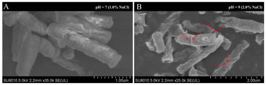 Scanning electron microscopy observations of the Priestia aryabhattai strain JL-5 under normal (A) and saline-alkali stress (B) conditions. The red arrows indicate the locations of asymmetric cell divisions.