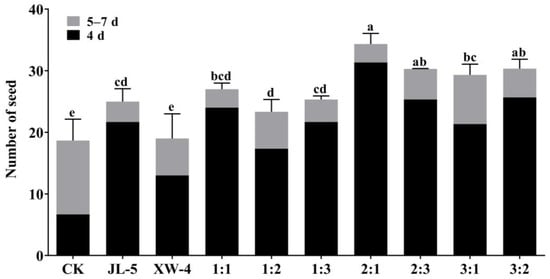 Germination of Leymus chinensis seeds treated with combined bacterial solutions of Priestia aryabhattai JL-5 and Staphylococcus pseudoxylosus XW-4 with different ratios. Control (CK) contains no bacterial solution. Different lowercase letters, a, b, c and d, indicate significant differences based on p < 0.05.