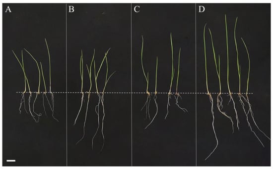 Phenotypic variations in Leymus chinensis plants treated with (A) no bacterial solution, (B) bacterial solution of Priestia aryabhattai JL-5, (C) bacterial solution of Staphylococcus pseudoxylosus XW-4 and (D) combined bacterial solutions of both JL-5 and XW-4. Scale bar = 1 cm. The dashed line indicates the location of the seeds, showing the roots and leaves below and above the line, respectively.