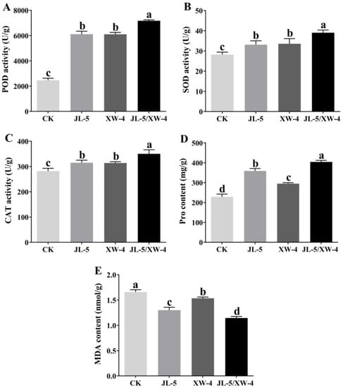 Variations in the contents of (A) peroxidase (POD), (B) superoxide dismutase (SOD), (C) catalase (CAT), (D) proline (Pro) and (E) malondialdehyde (MAD) in plants of Leymus chinensis treated with separate and combined bacterial solutions of Priestia aryabhattai JL-5 and Staphylococcus pseudoxylosus XW-4. Different lowercase letters, a, b, c and d, represent the significant differences based on p < 0.05.