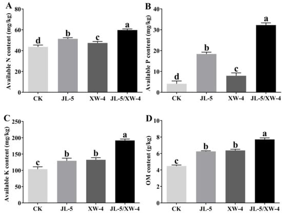 Variations in the soil nutrients of (A) nitrogen (N), (B) phosphorus (P) and (C) potassium (K) and (D) organic matter (OM) in soils treated with individual and combined bacterial solutions of Priestia aryabhattai JL-5 and Staphylococcus pseudoxylosus XW-4. Control (CK) contains no bacterial solutions. Different lowercase letters, a, b, c and d, represent the significant differences based on p < 0.05.