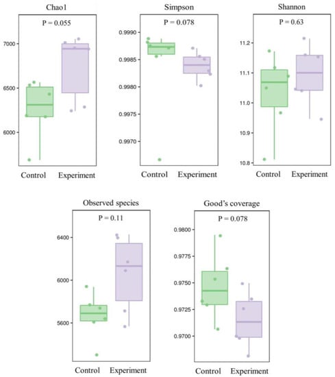 Microbial diversity based on the alpha diversity indices (i.e., Chao1, Simpson, Shannon, observed species and Good’s coverage) in soils of six control groups treated with no bacterial solutions and six experimental groups treated with the bacterial mixture of Priestia aryabhattai JL-5 and Staphylococcus pseudoxylosus XW-4.