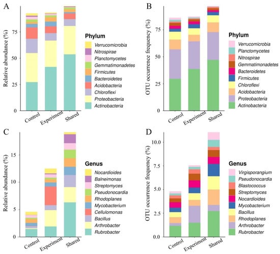 A total of 13,748 (38.09%) and 15,263 (42.29%) OTUs were uniquely identified in the experimental and control groups, respectively, sharing 7083 (19.62%) OTUs in both groups. The results showed that, at the phylum level, the relative abundances of Actinobacteria, Bacteroides and Firmicutes and the OTU occurrence frequencies of Actinobacteria and Firmicutes were significantly increased in the experimental groups (Figure 12A,B). At the genus level, the relative abundances of Rubrobacter, Arthroactor, Bacillus, Cellulomonas and Nocardioides and the OTU occurrence frequencies of Rubrobacter, Arthroactor, Bacillus, Mycobaterium, Nocardioides, Streptomycetes and Blastococus in the experimental groups were significantly higher than those of the control groups (Figure 12C,D).