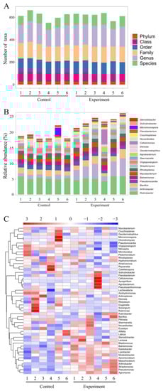 Significant differences were observed in the total number of taxa at various taxonomic levels between the experimental and control groups (Figure 13A). In particular, the top 20 genera showing the highest variations in the relative OTU abundance are shown in Figure 13B, including Trodider, Sotirubrobacter, Micromonospora, Flavobacterium, Couchioplanes, Nocardioides, Cellulomonas, Devosia, Geodermatophilus, Agrobacterium, Skermanella, Virgisporangium, Streptomyces, Rhodoplanes, Mycobacterium, Barneimonas, Pseudonocardia, Bacillus, Arthrobacter and Rubrobacter. The heatmap based on the association analysis of the top 50 genera revealed the significant increase in their relative abundance in a total of 28 genera (Figure 13C), including Agromyces, Pseudomonas, Streptomyces, Arthrobacter, Mesorhizobium, Aeromicrobium, Modestobacter, Lysobacter, Kaitobacter, Blastococcus, Lentzea, Steroidobacter, Labrys, Euzebya, Nocardioides, Skermanella, Bacillus, Rhizobium, Hyphomicrobium, Lechevalieria, Azospirllum, Pseudoxanthomonas, Solirubrobacter, Flavobacterium, Cellulomonas, Agrobacterium, Mycobacterium and Balneimonas. The significant decrease in the relative abundance was observed in the other 22 genera, including Chondromyces, Actinoplanes, Azohydromonas, Rubrivivax, Sorangium, Pilimelia, Catellatospora, Pedomicrobium, Reyranella, Amaricoccus, Microlunatus, Duganella, Afifella, Nitrospira, Micromonospora, Couchioplanes, Devosia, Geodermatophilus, Virgisporangium, Rhodoplanes, Rubrobacter and Pseudonocardia (Figure 13C).