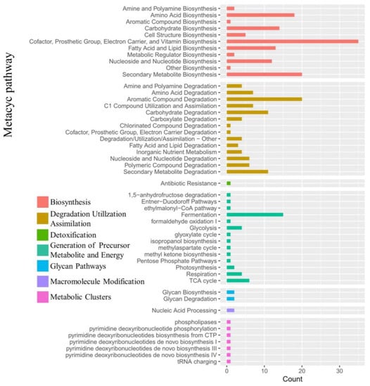 The enrichment analysis of the 16S rRNA data was performed using PICRUSt2 based on the MetaCyc Metabolic Pathway Database, with a group of seven categories of metabolic pathways significantly enriched, including biosynthesis, degradation utilization assimilation, detoxification, generation of the precursor metabolite and energy, glycan pathways, macromolecule modification and metabolic clusters (Figure 14). The highest numbers of genes were enriched in the categories of biosynthesis and degradation utilization assimilation, followed by detoxification. In particular, many metabolic pathways in the experimental groups were significantly enhanced by their interactions with the strains JL-5 and XW-4, e.g., the pathways involved in amino acid synthesis, cofactor electron carrier synthesis, fatty acid and lipid synthesis, nucleotide synthesis, fermentation and the TCA cycle.