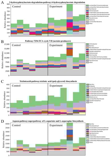 The significant enhancements were detected in four metabolic pathways in soil samples treated with bacterial solutions of both JL-5 and XW-4 (Figure 15), including the (1) 3-hydroxyphenylacetate degradation pathway: 4-hydroxyphenylacetate degradation, (2) pathway-7254: TCA cycle VII (acetate-producers), (3) teichoicacid-pathway: teichoic acid (poly-glycerol) biosynthesis and (4) aspasn-pathway: super-path of L-aspartate and L-asparagine biosynthesis (Figure 14). Among the taxa with a high relative abundance in the experimental groups, e.g., Bacillus, Kribbella and Arthrobacter, Bacillus was observed with the greatest variations in the synthesis of teichoic acid and the metabolism of aspartic acid under the treatment of combined bacterial solutions.