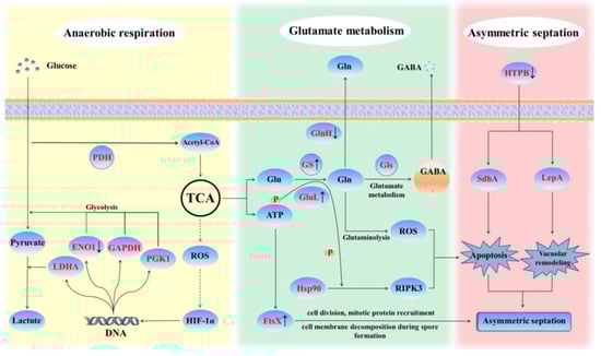 Schematic diagram of the molecular response to saline-alkali stress in Priestia aryabhattai JL-5. The enzymes highlighted in red are revealed with altered expression levels in this study, with symbols “↑” and “↓” indicating up-regulation and down-regulation, respectively. FtsX, permease-like cell division protein; PDH, pyruvate dehydrogenase; ENO1, enolase 1; GABA, γ-aminobutyric acid; GAPDH, glyceraldehyde-3-phosphate dehydrogenase; Gln, glutamine; Gls, glutaminase; Glu, glutamate; GlnH, glutamine ABC transporter substrate-binding protein; GluL, glutamate-ammonia ligase; GS, glutamine synthetase; HIF-1α, hypoxia-inducible factor-1α; Hsp90, heat shock protein 90; HTPB, high temperature protein B; LDHA, lactate dehydrogenase A; LepA, translation factor LepA; P, phosphate group; PGK1, phosphoglycerate kinase 1; RIPK3, receptor-interacting protein kinase 3; ROS, reactive oxygen species; SdhA, succinate dehydrogenase A.