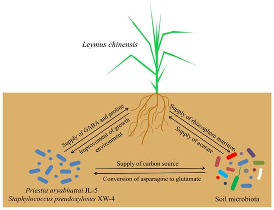 The synergistic effects of the strains JL-5 and XW-4, plants of L. chinensis and the local microbiota on the improvement of the saline-alkali soil property were summarized in Figure 17. Both the strains JL-5 and XW-4 provided GABA and proline for plants of L. chinensis to promote its growth and provided carbon sources and nutrients to soil microorganisms, which in turn alleviated soil salinization and improved the living environment of the strains JL-5 and XW-4. Furthermore, the well-established roots of L. chinensis could provide rhizosphere nutrients for soil microorganisms, ultimately enhancing the abundance of soil microbiota. Moreover, the soil microorganisms could promote the transformation of aspartate into Glu by the strain JL-5, promoting its effect on its saline-alkali tolerance and coordinating with XW-4 to provide carbon sources. Additionally, the acetate secreted by soil microorganisms could alleviate the saline-alkali stress on L. chinensis, ultimately promoting the growth of L. chinensis.