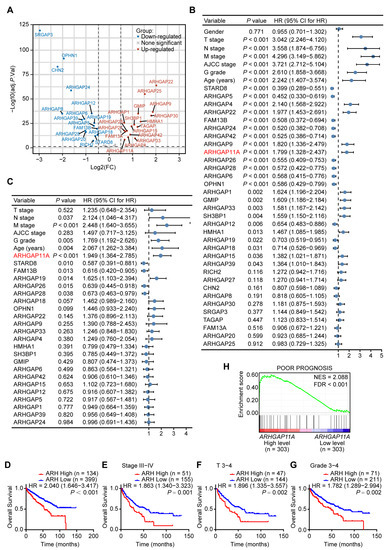 ARHGAP11A is a potential independent prognostic biomarker for ccRCC. (A) The volcano plot of 47 ARHGAPs genes in ccRCC samples (filtered criteria: |log2FC| > 0.5, adjusted p-value < 0.05). (B,C) Univariate (B) and multivariate (C) Cox regression analyses of RhoGAPs and patient overall survival in ccRCC, the gene in red is the target gene in this study. (D) The Kaplan–Meier (KM) curves of overall survival for ccRCC patients based on TCGA_KIRC data. (E–G) KM curves of overall survival for advanced ccRCC patients based on TCGA_KIRC data. (H) Enrichment plot of gene expression signature for poor prognosis (VANTVEER_BREAST_CANCER_POOR_PROGNOSIS) obtained by GSEA. The ccRCC samples from the TCGA_KIRC database were divided into high and low groups according to the quartile (D–G) or median value (H) of ARHGAP11A RNA-seq quantification results.