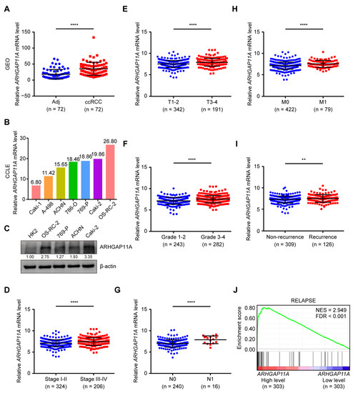 High ARHGAP11A level is positively correlated with the malignancy of ccRCC patients. (A,B) ARHGAP11A mRNA level was upregulated in both ccRCC tissues compared with adjacent normal tissues (A, GEO GSE53757 data) and RCC cells compared with immortalized renal epithelial HK2 cells (B, CCLE data). (C) WB verified that ARHGAP11A protein level was upregulated in RCC cells compared with HK2 cells. β-actin was used as a loading control. (D–F) ARHGAP11A mRNA level was gradually upregulated as AJCC stage (D), T stage (E), and Fuhrman grade (F) progressed. (G–I) ARHGAP11A mRNA level was positively correlated with lymph node metastasis (G), distant metastasis (H), and recurrence (I) in ccRCC patients. (J) Enrichment plot of gene expression signature for relapse (KAUFFMANN_MELANOMA_RELAPSE_UP) obtained by GSEA according to ARHGAP11A mRNA levels. The ccRCC samples from the TCGA_KIRC database were divided into high and low ARHGAP11A expression groups according to the median value of ARHGAP11A RNA-seq quantification results. ** p < 0.01, **** p < 0.0001.