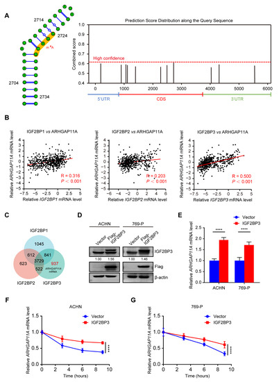 Due to the important role of ARHGAP11A level in ccRCC malignancy, we further investigated the mechanism underlying the upregulation of ARHGAP11A mRNA level. m6A is the most important mRNA modification, as it can affect mRNA stability and degradation, ultimately leading to an increase in the target mRNA level [22]. ARHGAP11A mRNA had abundant m6A modification sites, mainly in the CDS region (Figure 3A). This indicated that ARHGAP11A mRNA level might be regulated by m6A modification. Among m6A readers, only the insulin-like growth factor 2 mRNA-binding proteins (IGF2BPs; including IGF2BP1/2/3) could increase mRNA stability. Hence, we first analyzed the expression level correlation between ARHGAP11A and each member of the IGF2BPs. ARHGAP11A level was positively correlated with all members of the IGF2BPs (Figure 3B, R = 0.316, 0.203, 0.500 for IGF2BP1–3, respectively, all p < 0.001), with the highest correlation for IGF2BP3. Simultaneously, according to RNA immunoprecipitation and deep sequencing (RIP-seq) data GSE90639, ARHGAP11A mRNA was only present in the precipitation of IGF2BP3; i.e., only IGF2BP3 could bind to ARHGAP11A mRNA (Figure 3C). Hence, we speculated that IGF2BP3 might increase ARHGAP11A mRNA level.
