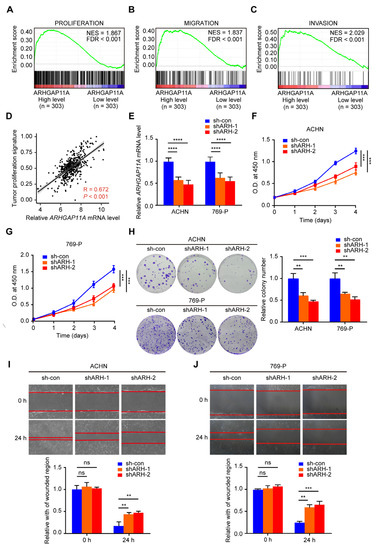 ARHGAP11A promotes renal cancer cell proliferation and migration. (A–C) Enrichment plots of gene expression signature for proliferation (A, CELL_PROLIFERATION_GO_0008283), migration (B, GOBP_MYELOID_LEUKOCYTE_MIGRATION), and invasion (C, PUIFFE_INVASION_INHIBITED_BY_ASCITES_UP) obtained by GSEA according to ARHGAP11A mRNA levels. The ccRCC samples from the TCGA_KIRC database were divided into high and low ARHGAP11A expression groups according to the median value of ARHGAP11A RNA-seq quantification results. (D) The correlation between ARHGAP11A level and the proliferation pathway by ssGSEA. (E) RT-qPCR results showed that ARHGAP11A was knocked down in RCC cell lines following transfection with ARHGAP11 knockdown plasmid compared with control vector. (F,G) ARHGAP11A knockdown suppressed RCC cell proliferation by CCK8 viability assay. (H) ARHGAP11A knockdown suppressed RCC cell colony formation by plate colony formation assay. (I,J) ARHGAP11A knockdown suppressed RCC cell migration by wound healing assay. ** p < 0.01, *** p < 0.001, **** p < 0.0001, ns—not significant.