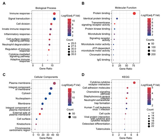 ARHGAP11A is associated with immune response. (A–C) Bubble chart of biological processes (A), molecular functions (B) and cellular components (C) according to GO analyses of ARHGAP11A-related DEGs. (D) KEGG pathway enrichment analysis of ARHGAP11A-related DEGs.