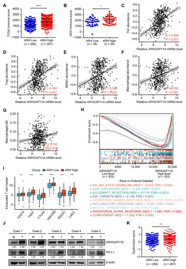 High ARHGAP11A level contributes to suppressive TIME in ccRCC. (A,B) Comparison of immune score between the high- and low-ARHGAP11A groups based on the ESTIMATE algorithm for TCGA_KIRC data (A) and GSE53757 data (B). (C–F) ARHGAP11A level was positively correlated with abundance of Th2 (C), Treg (D), MDSC (E), and macrophage (F) cells based on the KIRC TISIDB database. (G) ARHGAP11A level was positively correlated with abundance of M2 macrophages based on the CIBERSORT algorithm from the TCGA_KIRC database. (H) Enrichment plot of ARHGAP11A level for hallmark gene sets. The ccRCC samples from the TCGA_KIRC database were divided into high and low ARHGAP11A expression groups according to the median value of ARHGAP11A RNA-seq quantification results. (I) Exhausted T cell markers were upregulated in the ARHGAP11A high-level group. (J) ARHGAP11A and PD-L1 protein levels were concurrently upregulated in ccRCC tissues compared with paired normal tissues. Protein levels were detected by WB assay. (K) Dysfunction score for T cells was upregulated in the ARHGAP11A high-level group. * p < 0.05, ** p < 0.01, *** p < 0.001, **** p < 0.0001.