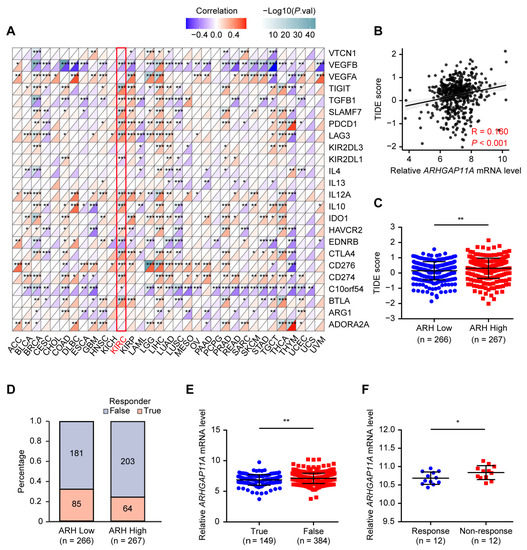 Renal tumors with low ARHGAP11A level are sensitive to ICIs therapy. (A) Correlation of RNA levels with inhibitory ICs expression in pan-cancer, red represented positive correlation, blue represented negative correlation. The darker the color, the stronger the correlation. (B) High ARHGAP11A level was positively associated with TIDE scores. (C) ccRCC patients with high ARHGAP11A level have a higher TIDE score. (D) The distribution of “True” or “False” responder in the high and low ARHGAP11A groups through the TIDE algorithm. (E) “TRUE-responder” group had a lower ARHGAP11A level. (F) ARHGAP11A expression in renal cancer-bearing mice responding or not responding to anti-PD-L1 and anti-CTLA-4 therapy. * p < 0.05, ** p < 0.01, *** p < 0.001.