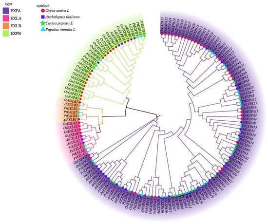 2.1. Identification of Expansin Genes in Populus and Phylogenetic Relationships
