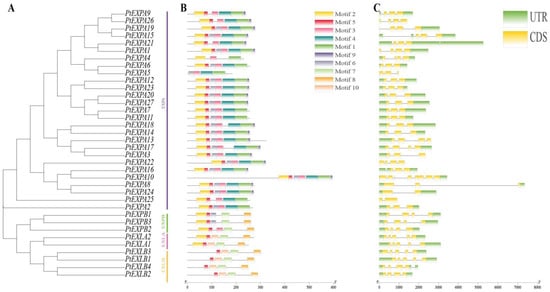 2.2. Gene Structures and Conserved Protein Motifs of PtEXs