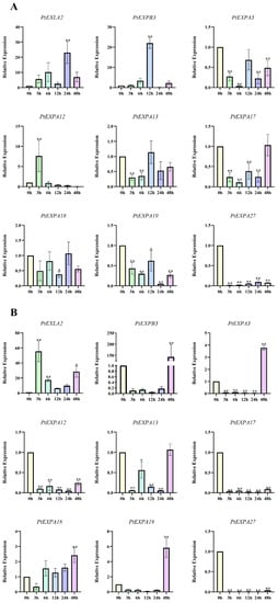 Yin, Z.; Zhou, F.; Chen, Y.; Wu, H.; Yin, T. Genome-Wide Analysis of the Expansin Gene Family in Populus and Characterization of Expression Changes in Response to Phytohormone (Abscisic Acid) and Abiotic (Low-Temperature) Stresses. Int. J. Mol. Sci. 2023, 24, 7759. https://doi.org/10.3390/ijms24097759