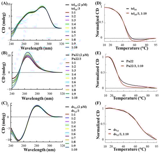 CD spectra of 2 μM solutions of tel26 G-quadruplex (A), Pu22 G-quadruplex (B) and ds12 duplex (C), in 20 mM KCl, 5 mM potassium phosphate buffer (pH 7) for tel26 and ds12 or in 10 mM Tris-HCl buffer (pH 7) for Pu22, in the presence of increasing amounts (up to 10 equivalents) of 3. CD melting curves for tel26 G-quadruplex (D), Pu22 G-quadruplex (E) and ds12 duplex (F) in the absence and presence of 10 molar equivalents of 3, recorded at 290, 265 and 251 nm for tel26, Pu22 and ds12, respectively.
