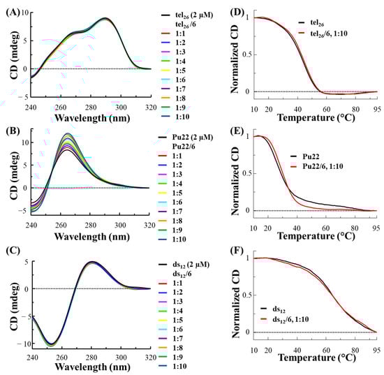 CD spectra of 2 μM solutions of tel26 G-quadruplex (A), Pu22 G-quadruplex (B) and ds12 duplex (C), in 20 mM KCl, 5 mM potassium phosphate buffer (pH 7) for tel26 and ds12 or in 10 mM Tris-HCl buffer (pH 7) for Pu22, in the presence of increasing amounts (up to 10 equivalents) of 6. CD melting curves for tel26 G-quadruplex (D), Pu22 G-quadruplex (E) and ds12 duplex (F) in the absence and presence of 10 molar equivalents of 6, recorded at 290, 265 and 251 nm for tel26, Pu22 and ds12, respectively.