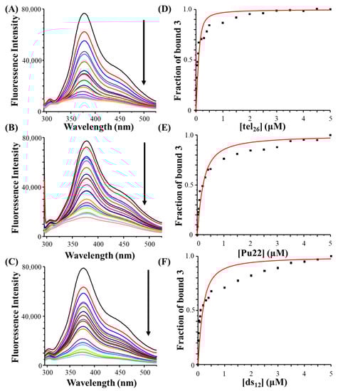 Fluorescence titration experiments were thus performed on 3 by adding increasing amounts of tel26 G-quadruplex, Pu22 G-quadruplex and ds12 duplex to solutions of the ligand kept at a fixed concentration. A dose-dependent fluorescence quenching was detected in all titration experiments (Figure 3A–C), proving that 3 was able to interact with all the investigated DNA sequences.