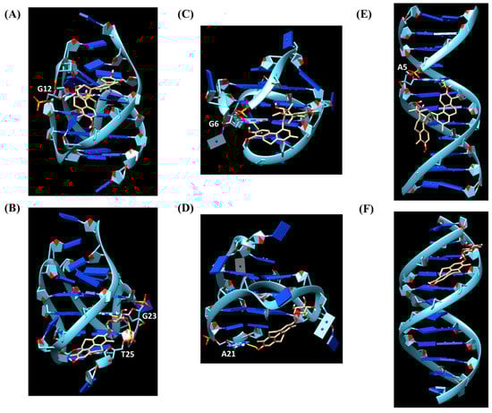 Finally, in the case of the interaction of 3 with the ds12 duplex, the most populated cluster showed a pose involving the binding of the ligand to the central region of the major groove of the duplex (Figure 4E), to which a binding energy of −8.0 kcal/mol was associated. A hydrogen bond between the oxygen of the OH-2′ of 3 and the hydrogen of the exocyclic NH2 of A5 was observed. On the other hand, 6 targeted one of the extremities of the minor groove of the duplex (Figure 4F). A binding energy of −7.9 kcal/mol was calculated for this binding pose.