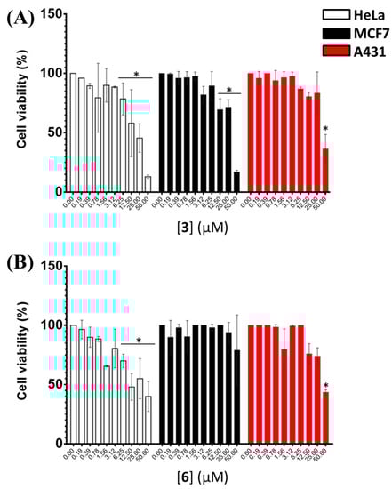 Effects of increasing concentrations of (A) 3 and (B) 6 (0–50 μM) on the viability of HeLa, MCF7 and A431 human cancer cells after 48 h of incubation. Cell viability values are expressed as the percentage of viable cells for treated vs. control cells grown in the absence of the tested compounds. Three independent experiments were performed with triplicated determinations. * p < 0.05 were obtained for treated vs. control samples.