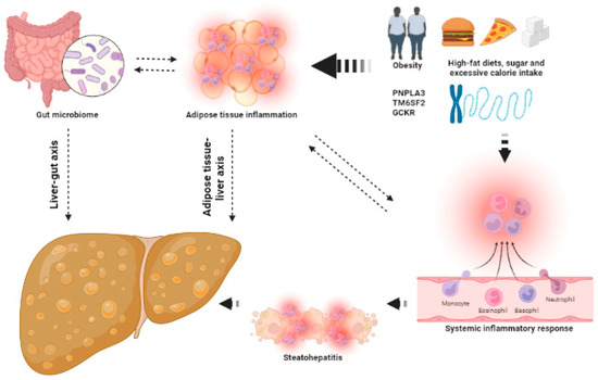 The keys aspects of the pathophysiology of NAFLD. Several factors, such as obesity, high-fat diets and (epi)genetics, lead to adipose tissue inflammation and dysbiosis, increasing systemic inflammatory response and leading to the development of hepatic steatosis and steatohepatitis. This image has been created using BioRender.
