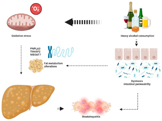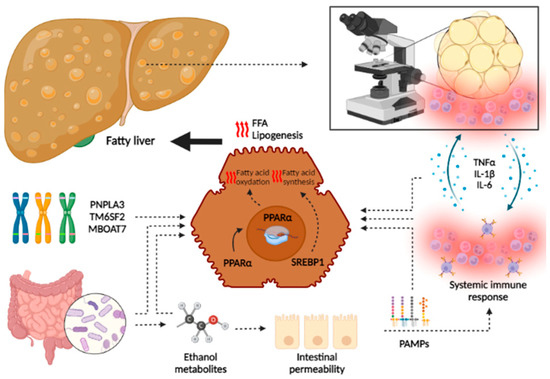 Alcohol can induce hepatic steatosis through several mechanisms. The main process for the development of hepatic steatosis and AFL comprises alterations in fat metabolism [117,118]. In this way, alcohol increases the proportion of reduced NAD (NADH) in hepatocytes, which inhibits mitochondrial β -oxidation of fatty acids and leads to steatosis. Moreover, upregulation of SREBP1 and inhibition of peroxisome proliferator-activated receptor-α (PPARα, which upregulates many genes involved in free fatty acid transport and oxidation) contribute to the development of hepatic fat accumulation [119,120].