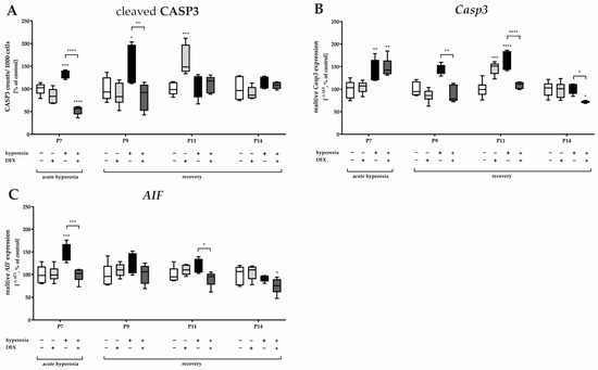 It is already known that oxidative stress is a potent trigger of apoptosis, which then contributes greatly to neuronal cell death in hyperoxia in addition to physiological apoptosis. ROS intrinsically induce mitochondria-dependent apoptosis via caspase-independent mediators, such as AIF, or through the release of cytochrome c and the downstream activation of caspases. AIF is thereby induced by ROS released from mitochondria [55]. The results of this study showed that hyperoxia induced a significant increase in AIF and Casp3 at the mRNA level, confirmed by the cellular increase in cleaved CASP3-positive and thus apoptotic cells in cerebellar white matter. In accordance with the increase in oxidative stress response, increased cell death was detected, and as well the protective effect of DEX was determined.