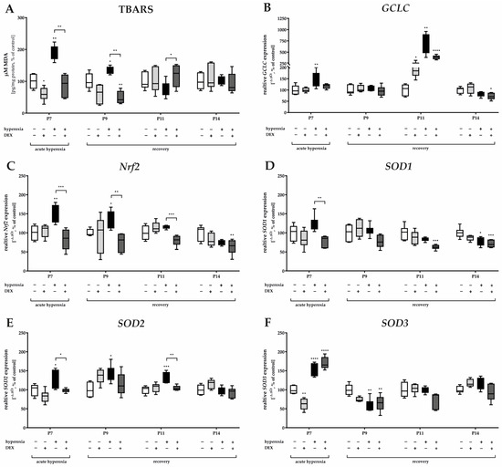 Hyperoxia induced a significant increase in lipid peroxidation products (thiobarbituric acid reactive substances, TBARS) immediately after hyperoxia exposure at P7 and persisted with recovery at ambient air until P9 (Figure 3A). Hyperoxia induced a significant increase in GCLC transcripts, a rate-limiting enzyme for glutathione synthesis, at P7 and P11 compared with the control (Figure 3B). Nrf2 transcripts, a transcription factor for various antioxidant enzymes and proteins such as GCLC, were adequately induced by hyperoxia at P7 and P9 (Figure 3C). DEX was able to reduce lipid peroxidation at both P7 and P9 (Figure 3A), and this occurred in correspondence with a reduction of Nrf2 at P7, P9, and P11 (Figure 3C). DEX also tended to decrease the expression of GCLC at P7 and P11 when administered as a pretreatment to hyperoxia, but this effect was not significant (Figure 3B). Superoxide dismutase (SOD), an important endogenous antioxidant enzyme, requires metal cofactors for its activity and conditions different isoforms such as cytoplasmic Cu/Zn-SOD (SOD1), mitochondrial Mn-SOD (SOD2), and extracellular Cu/Zn-SOD (SOD3). All three SOD isoforms increase transcription by high oxygen concentrations at P7 (Figure 3D–F); SOD2 increased at P9 and P11 (Figure 3E). DEX had a reducing effect on the transcription of SOD1 and SOD2 at P7 and/or P11 (Figure 3D,E) but not of SOD3 at P7 (Figure 3F). Later on, the expression of SOD1 and SOD3 appeared to be depleted, resulting in reduced expression at P14 for SOD1 and at P9 for SOD3 (Figure 3F) with no further effects from treatment with DEX. DEX application from normoxic-maintained animals had few effects on the antioxidant response, such as a decrease at P7 for SOD3 (Figure 3F). The complete data are presented in Supplementary Table S2.