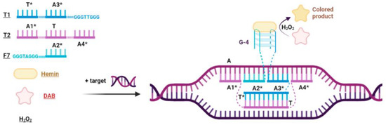 The design of PxDM is shown in Figure 1. The system consists of three oligonucleotides: T1, T2, and F7 (Table S2). Domains, or arms, A1*, A2*, A3*, and A4* of the T1, T2 and F7, have been designed complementarily, according to target sequence A. The T2 sequence is required for unwinding double-stranded DNA by hybridizing the A1* and A4* PxDM fragments to the target. This allows the A2* and A3* parts of the T1 and F7 sequences to selectively recognize the gene region. The structure of the DNA machine is fully assembled only when both G-rich sequences in T1 and F7 are close to each other and form the G-4 structure. The G-4 structure can bind hemin and form DNAzyme to catalyze the oxidation of a colorless substrate and generate a visual signal [5,17]. T and T* fragments associate into a dsDNA structure that stabilizes the PxDM in the solution. The F7 arm remains unbound to ensure the core formation only in a presence of analyte.