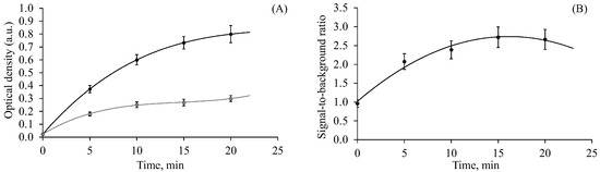 To determine the most suitable time to carry out the peroxidase reaction, the optical density of the solution was measured after different incubation time periods (Figure 4A). In addition, the signal-to-background ratio (S/B) was analyzed (Figure 4B). Thus, during the reaction, not only did the signal level increase but so did the background level leading to a decrease in the S/B. Thus, the most optimal incubation time with the greatest S/B was 15–20 min (Figure 4B). However, even after 5 min, we could clearly distinguish the signal from the background with the naked eye.