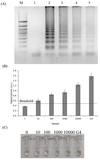 Sensitivity of PxD machine/SPA system. (A) SPA products analysis with various numbers of genomic equivalents (GE), 2% agarose gel: M—marker 50 bp+; 1—negative control; 2—10,000 GE; 3—1000 GE; 4—100 GE; 5—10 GE; (B) Colorimetric analysis of SPA product detection with various numbers of genomic equivalents. (C) The corresponding photographs of the colorimetric responses.