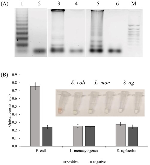 Specificity of E. coli PxD machine. (A) Amplification products analysis: 1—E. coli; 2—E. coli negative control; 3—Listeria monocytogenes; 4—Listeria monocytogenes negative control; 5—Streptococcus agalactiae; 6—Streptococcus agalactiae negative control; M—marker 50 bp+; (B) Colorimetric analysis of E. coli, L. monocytogenes (L. mon), and S. agalactiae (S. ag) amplicons (300 ng each) detection.