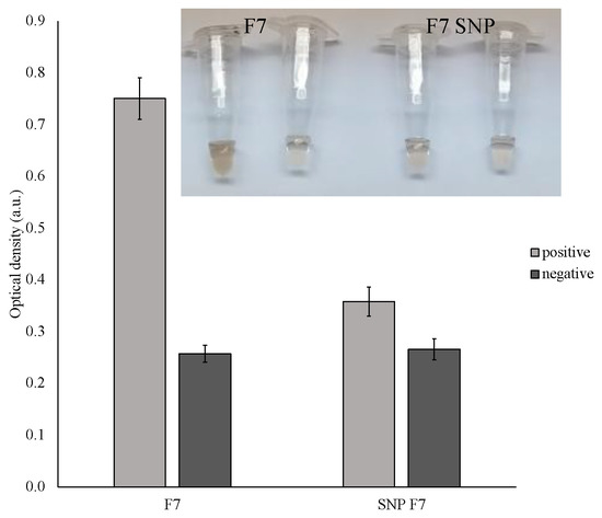 To evaluate the visual biosensor ability to detect SNPs, a perfectly matched F7 and similar F7 sensor with a single-base mismatch was further investigated by comparing the absorbance response of the colorimetric system (Figure 7). The amount of staining was significantly lower when a mutated sensor was used. On the other hand, some coloration can be observed in the mismatched analyte and, therefore, if the sensor is supposed to be used in the mutation-prone region, the declared limit-of-detection should be carefully evaluated. More information and supporting experiments on single-base mismatch detection can be found in our previous studies [5,23].