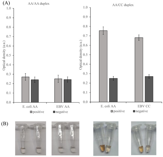(A)AA E. coli/AA Epstein–Barr virus and AA E. coli/CC Epstein–Barr virus duplex amplicon analysis; (B) Corresponding photographs of the reaction tubes. The E. coli product was detected via the E. coli PxDM sensor and the EBV product was detected via the EBV PxDM sensor. Colorimetric analysis of reaction buffer in the presence (positive) or absence (negative) of 300 ng of purified SPA product. Strand concentrations: 1 μM of T1, 1 μM of T2, 1 μM of F7. Inset: the corresponding photograph of the color change.