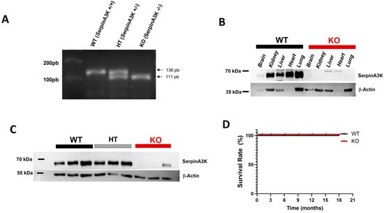Characterization of SerpinA3K-deficient mice. (A) Genotyping for WT, HT, and KOSA3 mice, (B) SerpinA3K expression in brain, kidney, liver, heart, and lung, (C) kidney expression of SerpinA3K. (D) Survival rate in the following 18 months.