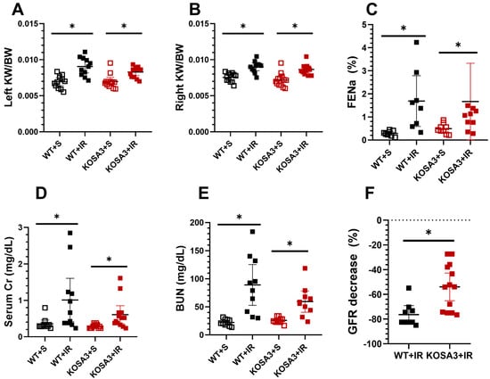 Impact of SerpinA3K deficiency during AKI. (A,B) Left and right kidney normalized by body weight, (C) fractional excretion of sodium (FENa), (D) serum creatinine, (E) blood urea nitrogen (BUN), (F) percentage decrease in glomerular filtration rate (GFR) in the WT+IR and KOSA+IR groups compared with their respective control, the WT+S and KOSA3+S groups. n = 8–13 per group. * p < 0.05 vs. the group stated by the upper solid bar. WT+S: WT [SerpinA3K(+/+)] + sham surgery, WT+IR: WT + ischemia/reperfusion of 30 min, KOSA3+S: KO [SerpinA3K(−/−)] + sham surgery, KOSA3+IR: KO + ischemia/reperfusion of 30 min. KW: kidney weight, BW: body weight.