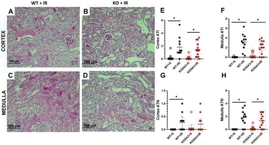 Histopathological evaluation. (A–D) Representative microphotographs of kidney cortex (upper panel) and medulla (lower panel) for the WT+IR and KOSA3+IR groups, respectively, 24 h after I/R. (E,F) Acute tubular injury (ATI) score for kidney cortex and medulla. (G,H) Acute tubular necrosis (ATN) score for kidney cortex and medulla. n = 10–13 per group. * p < 0.05 vs. the group stated by the upper solid bar.