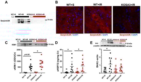 In addition, to the histopathological findings, urinary biomarkers of AKI were assessed. As we previously reported, urinary SerpinA3K excretion (uSA3K) was detected in the WT+IR group but not in the WT+S group. The expected absence of uSA3K in the KOSA3 groups was confirmed (Figure 4A). In Figure 4B are representative microphotographs of SerpinA3K immunofluorescence for the WT+S, WT+IR, and KOSA3+IR groups. In the WT+S mice, SerpinA3K was mainly observed in the cytosol of tubular epithelial cells. This expression was more evident in the WT+IR group, together with the relocation to the apical membrane, as we previously reported in rats and humans with AKI and CKD diseases [,,]. As expected, no immunostaining was observed in the KOSA3+IR group. According to our histopathological findings, urinary biomarkers of AKI: KIM1 and HSP72 increased significantly in both the WT+IR and the KOSA3+IR groups (Figure 4C,D). Finally, cellular apoptosis was indirectly evaluated by assessing the pro-apoptotic protein BAX. As expected, BAX expression was significantly increased in the WT+IR group, but such an increment was not seen in the KOSA3+IR group (Figure 4E).