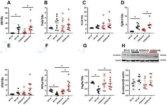 The immune response was evaluated through pro-inflammatory cytokines mRNA levels like Il6, Tnf-alpha, and Ccl2. We only observed a significant elevation of Il-6 in both the WT+IR and the KOSA3+IR groups (Figure 5A–C). At the same time, reparative cytokines were evaluated. Ischemic injury induced an increase in Tgfb1 in the WT+IR and KOSA3+IR groups with no difference in Il-10 (Figure 5D,E). It is well known that inflammation can be regulated by the Wnt-β-catenin pathway []. Under normal conditions, it is continuously degraded, but it is preserved during cellular stress. Therefore, β-catenin expression was explored; however, no differences were observed among the studied groups, as is shown in Figure 5H. Additionally, it has been reported that in the initial response to I/R there is an association between β-catenin and HIF-1α, the major responder to hypoxia. Hif1a was only upregulated in the KOSA3+IR group (Figure 5F) []. In correspondence to this finding, Vegfa, that is a target of Hif1a, was upregulated in the KOSA3+IR, while the WT+IR group showed a down-regulation of Hif1a and Vegfa (Figure 5F,G).