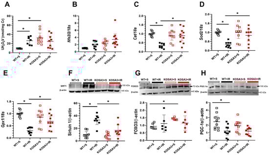 Response to oxidative stress. (A) Urinary hydrogen peroxide excretion/creatinine ratio, UH2O2 (B) Nfel2l2, (C) Cat, (D) Sod2, (E) Gpx1 mRNA levels. Representative Western blots for (F) Sirtuin 1, (G) FOXO3, and (H) PGC-1α. n = 6–11 per group. * p < 0.05 vs. the group stated by the upper solid bar.
