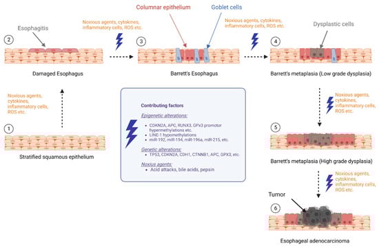 Epigenetic alterations during progression of Barrett’s esophagus to esophageal cancer (BE: Barrett’s esophagus, LGD: low-grade dysplasia, HGD: high-grade dysplasia, and EAC: esophageal adenocarcinoma) (The figure created with biorender.com, accessed on 23 March 2023).