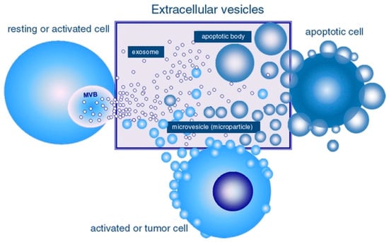 Schematic representation of the extracellular vesicles. Major populations include exosomes, microvesicles, and apoptotic bodies. Source: György, Szabó, Pásztói, Pál, Misják, Aradi, László, Pállinger, Pap, Kittel, Nagy, Falus and Buzás [].